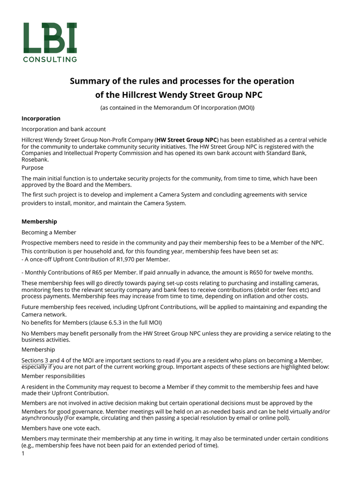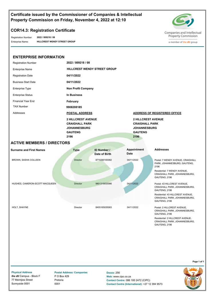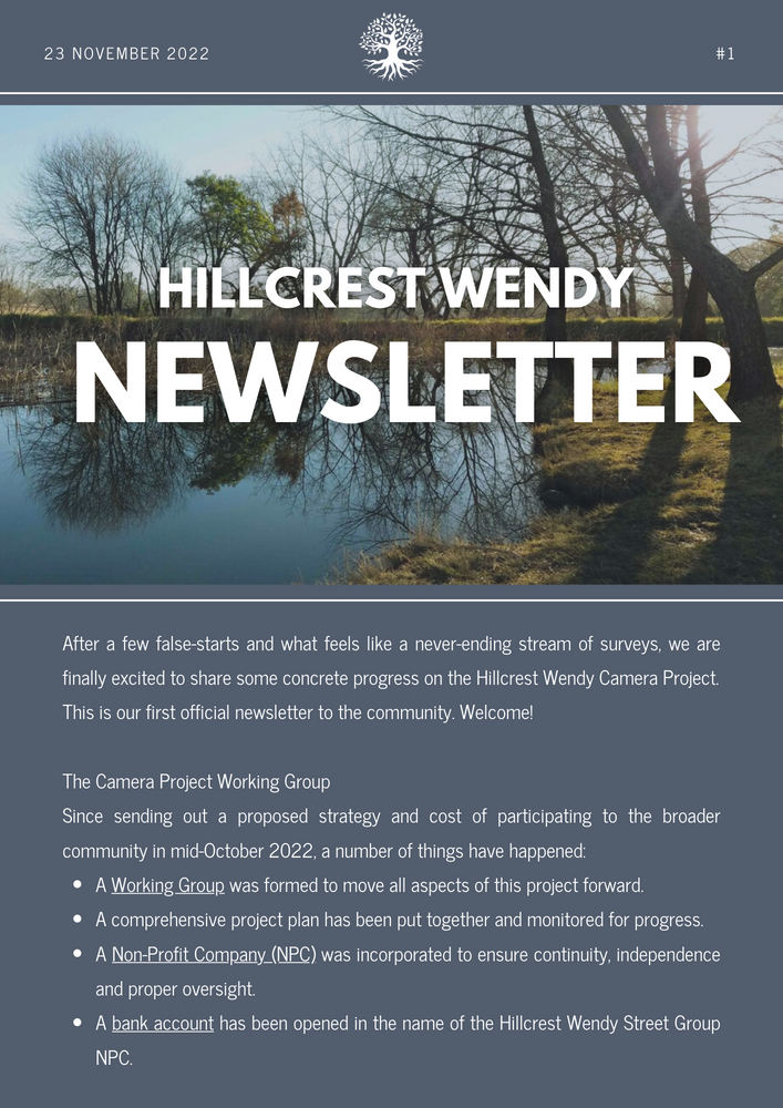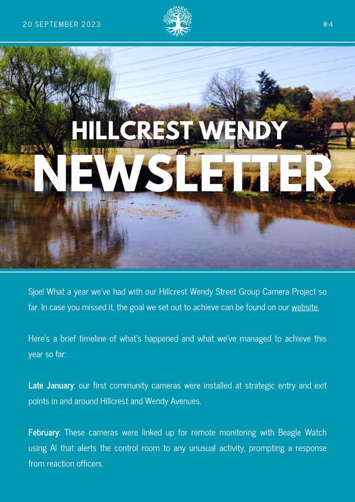 As a community, we are committed to ensuring the safety and security of our neighbourhood. The Hillcrest Wendy Street Group is a Non-Profit Company (NPC) set up to implement and manage community security projects, explore ways to collectively deter and reduce criminal activity in cost effective ways and pool resources to take action and create meaningful impact.